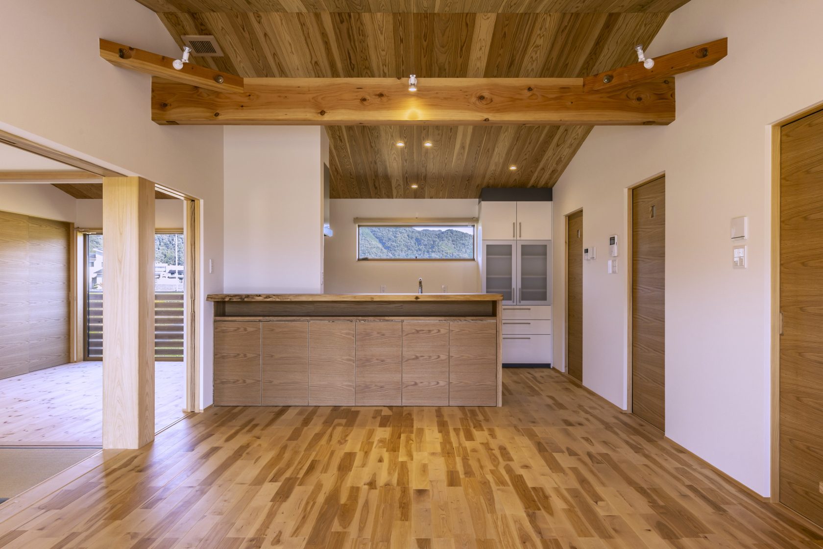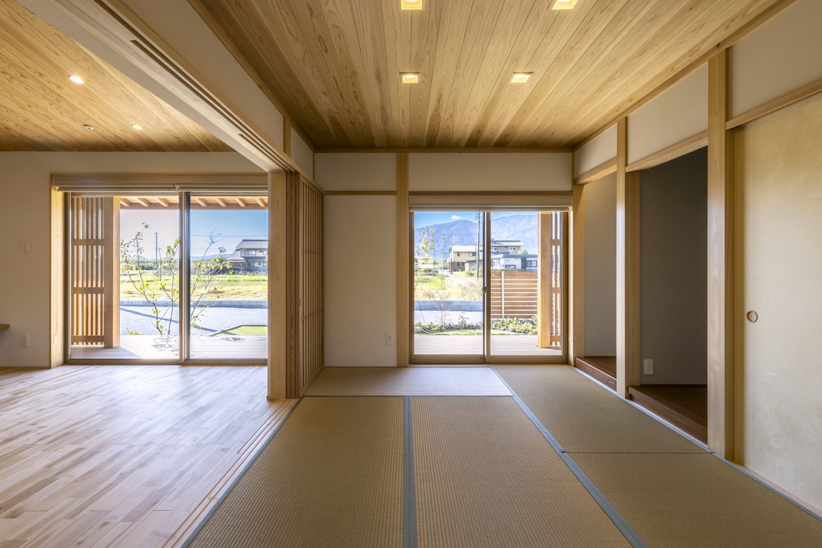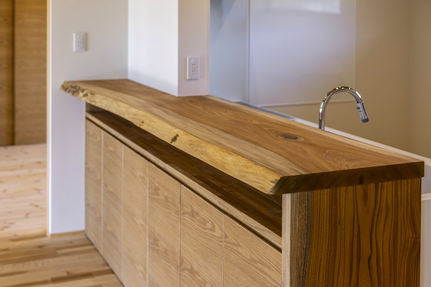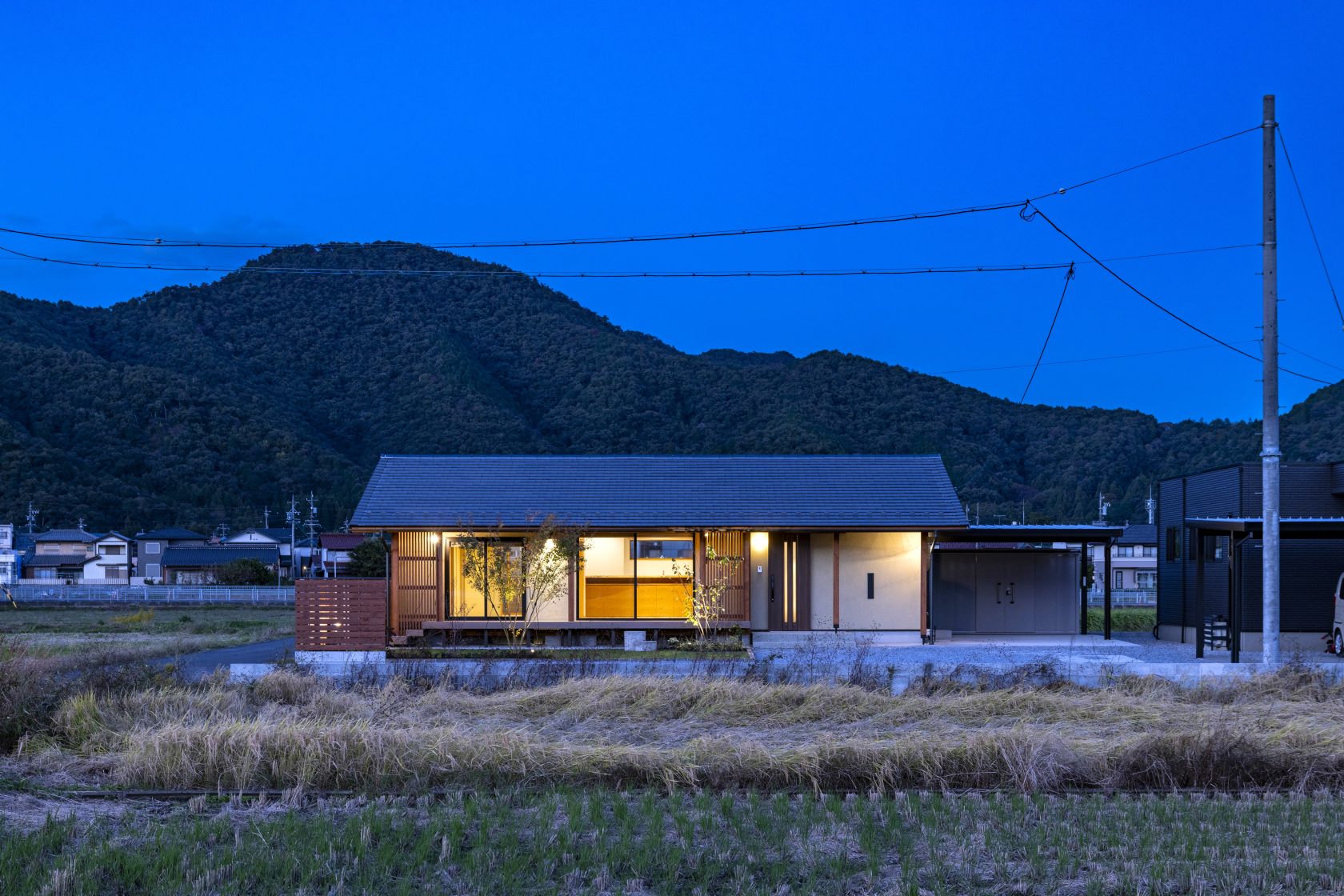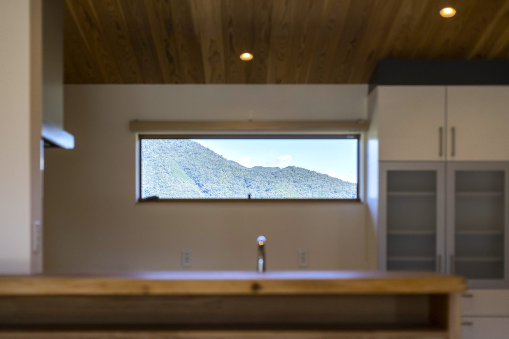 遠景に山並みをたたえる終の棲家。周囲の自然環境を借景するために窓の高さや配置を計画し、その風景と重ね合わせるように草花や庭木を散りばめた。また細やかにヒアリングを行い収納計画と動線計画がこれからの暮らしにマッチするよう家具をデザインした。